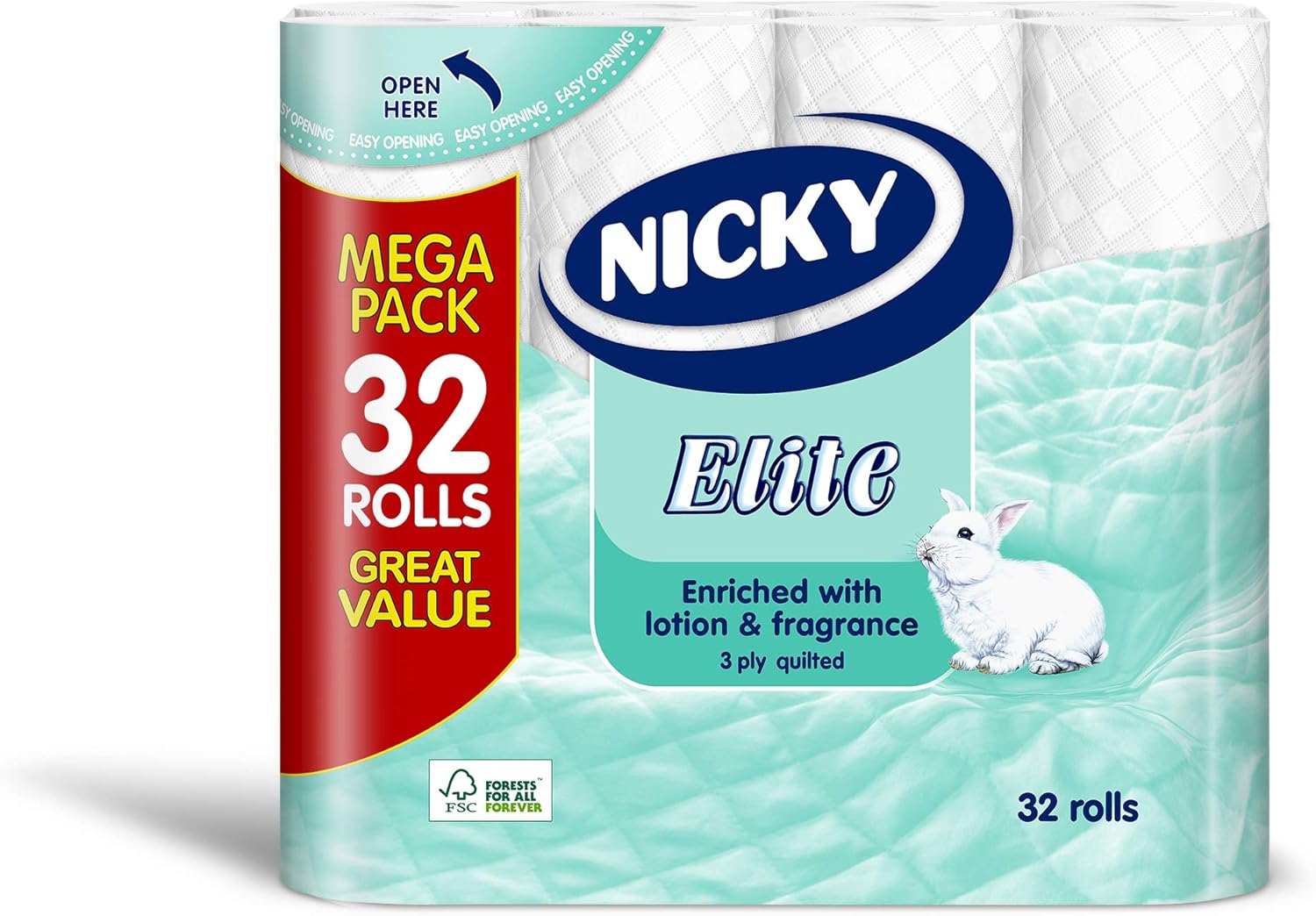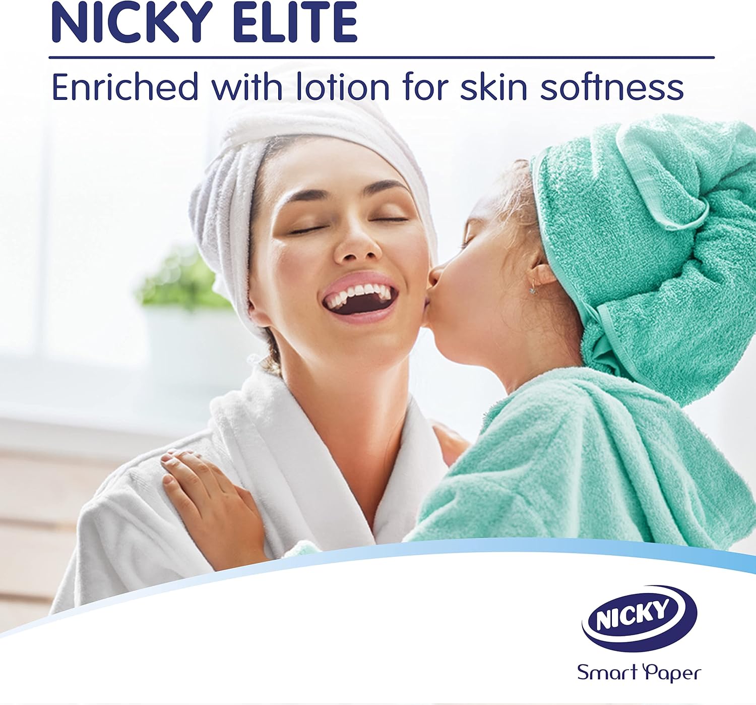 • Nicky tissue, Nicky tissue, Nicky tissue, Nicky Elite white toilet tissue, 3 ply, 168 sheets, 32 rolls (32 x 168 3-ply-sheets).